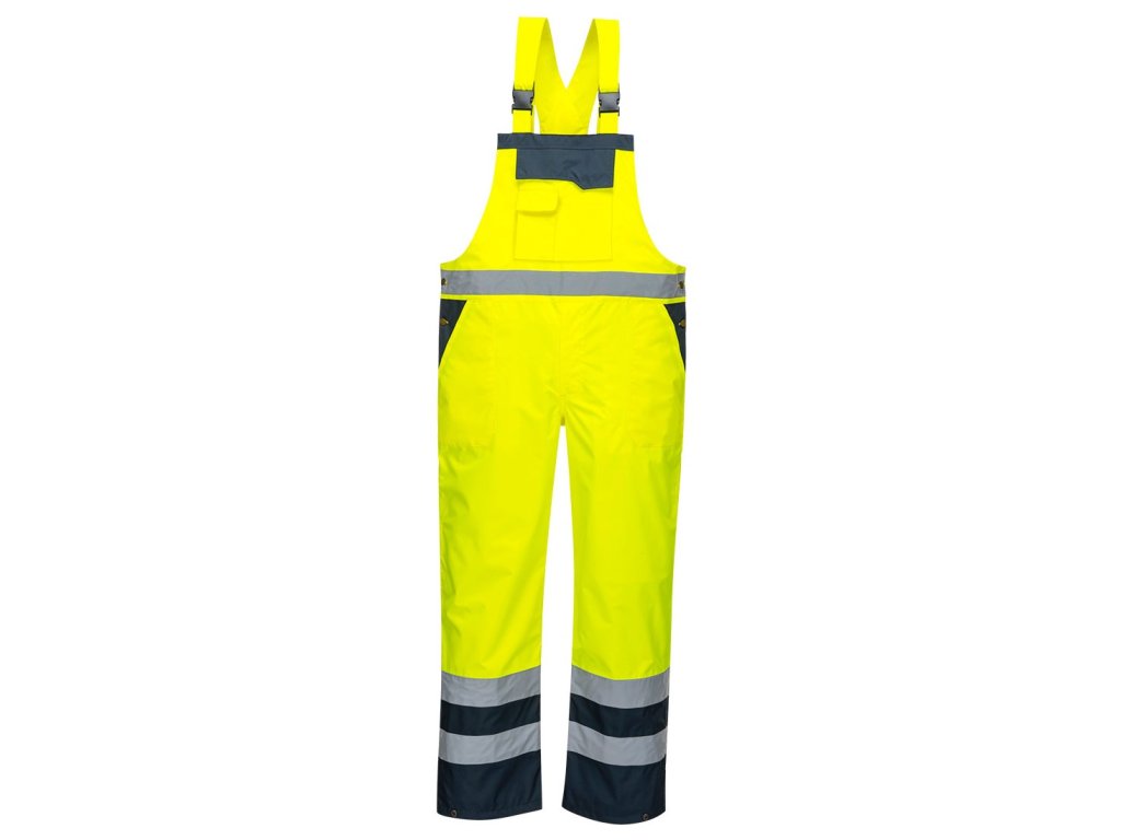 Praktické a bezpečné, dvoubarevné laclové kalhoty chrání spodní část těla a hruď. Nastavitelné zapínání a elastická zadní část pro pohodlné nošení.